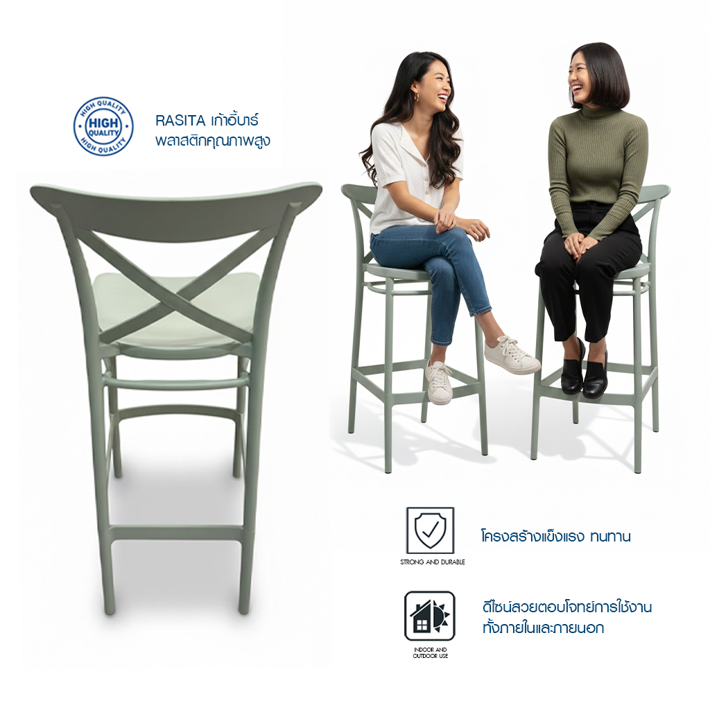 เติมเต็มทุกมุมโปรดของคุณด้วยเก้าอี้บาร์ดีไซน์ทันสมัยจาก RASITA รุ่น HARLOW โดดเด่นด้วยโทนสีเขียวที่ให้ความรู้สึกสดชื่น ผลิตจากวัสดุคุณภาพสูง แข็งแรง และเป็นมิตรต่อสิ่งแวดล้อม เหมาะสำหรับการใช้งานได้หลากหลายทั้งภายในและภายนอกอาคาร
