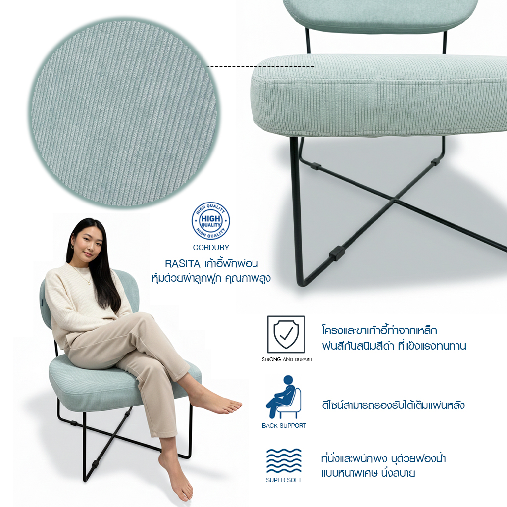 เติมเต็มทุกช่วงเวลาการพักผ่อนให้สบายและมีสไตล์ ด้วย เก้าอี้พักผ่อน RASITA รุ่น Wendy ดีไซน์เรียบหรู สี MINT โทนละมุน สวยงามทุกมุมมอง ช่วยสร้างบรรยากาศอบอุ่นและผ่อนคลายให้กับทุกพื้นที่ ไม่ว่าจะเป็นห้องนั่งเล่น ห้องนอน มุมอ่านหนังสือ หรือคาเฟ่